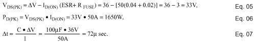 but charging current is initially limited by Q1's ID(ON) ≈ 50mA until the MOSFET emerges from saturation and operation enters the resistive region, when the current decays exponentially to zero. - Determine the current pulse width, the voltage across the MOSFET, and the peak transient power in the MOSFET. The applied 36V transient will be distributed across RDS(ON), RFUSE, and capacitor ESR.