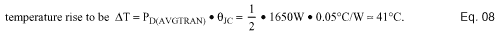 (7.5 x 10-5) on the horizontal axis, and rising vertically to intercept the solid (single pulse) line, we read the transient thermal resistance on the vertical axis to be ΘJC = 0.05°C/W. We calculate junction