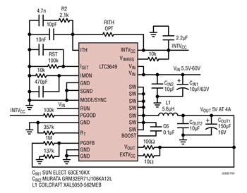 A 5V output power supply is shown in Figure 1. This circuit is centered on the extremely small footprint high voltage step-down DC/DC LTC3649. The input voltage extends up to 60V and the output is set to 5V at 4A. Only a few additional components are required for the complete solution, including inductor L1 and a few passive components.