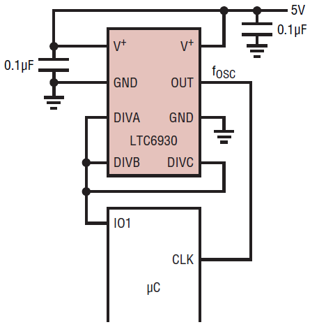 The output frequency of the LTC6930 is set by three DIV pins, which control an internal clock divider. The factory set master oscillator frequency may be divided by a factor of up to 128, and switching between these division modes is accomplished within a single clock period and without slivers or runt pulses. All three pins may be tied together to enable a simple digital signal from a microcontroller to shift the clock down by a factor of 128 as shown in Figure 1. This is enough to bring an 8MHz clock down to 64kHz.