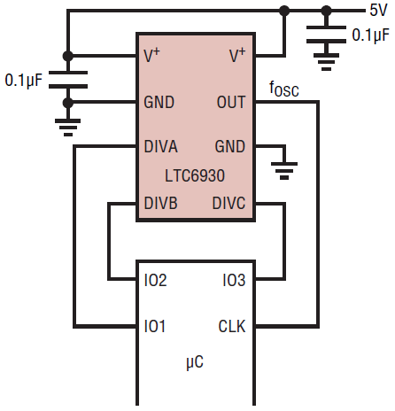 Figure 2. Fine control of the the LTC6930’s frequency via three microprocessor I/O pins.
