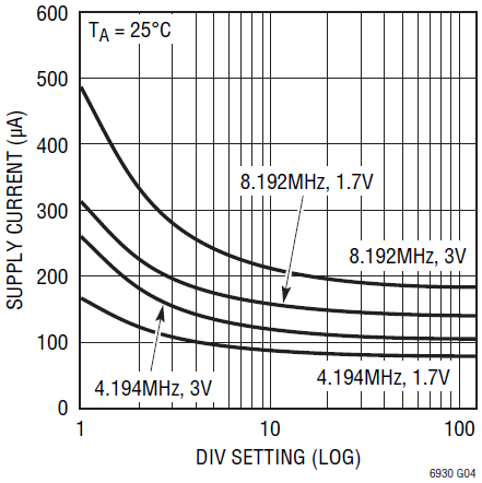Figure 3. The LTC6930 supply current at different divide ratios.