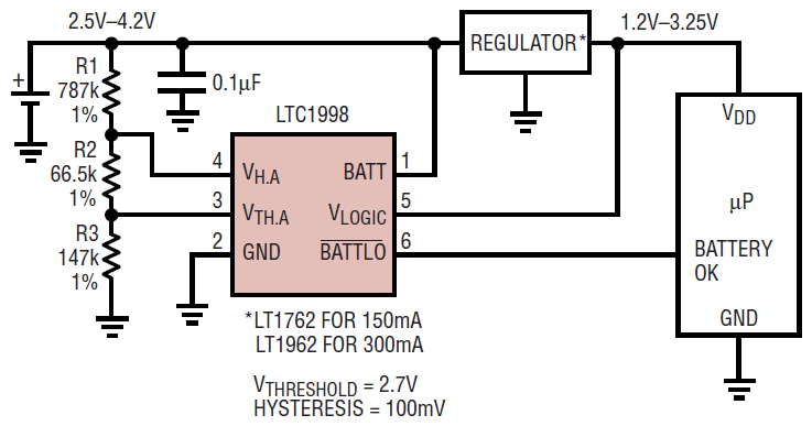 Hysteresis is programmable via the hysteresis-adjust pin VH.A). This pin works in exactly the same way as the low-battery threshold adjust pin, except that it controls the threshold at which the BATTLO signal changes state from low to high, indicating a charged battery condition. Both the low-battery threshold voltage and the hysteresis-threshold voltage may be programmed to be between 2.5V and 3.25V; the hysteresis is the difference between these two thresholds. The hysteresis may be as large as 750mV. This large hysteresis prevents false state changes at the output due to transients or battery recovery. The system may then be designed to automatically reduce the battery load current when a battery-low signal is received. If the battery voltage recovers under this reduced load, the output of the LTC1998 will maintain a low output state. Both thresholds may be programmed using just three external resistors, as shown in Figure 2, minimizing component count. The threshold-adjust and hysteresis-adjust pins exhibit very high input impedance, which allows the use of large external program resistors to reduce the battery drain current.