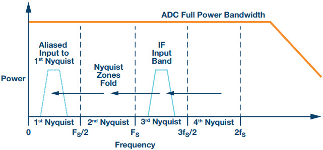 Aerospace and defense applications such as electronic warfare and active phased array radar often require the use of a higher order Nyquist rate band to ferret out wider frequency communications. Not only is a larger observed bandwidth needed from a system ADC, but systems are also pushing the need for a higher full power bandwidth. If an ADC’s input frequency bandwidth is high enough, it is possible to downconvert directly within the ADC by undersampling the IF signal band of interest.