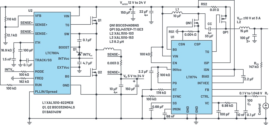 4象限コントローラ(第2段)U1を中心とする2段構成の電源を図1に示します。この4象限コンバータは中間バス・コンバータVINTER(第1段)を入力として、最小最大値で12V~24V、公称値で12V~16Vの範囲の出力電圧を供給します。これは、車載バッテリ・レールの公称電圧範囲に一致しています。2段構成コンバータ全体としての出力は±10Vで、負荷に3Aの電流を供給します。出力電圧は、コントローラU1のCTRLピンの電圧源CONTROL信号によって制御されます。