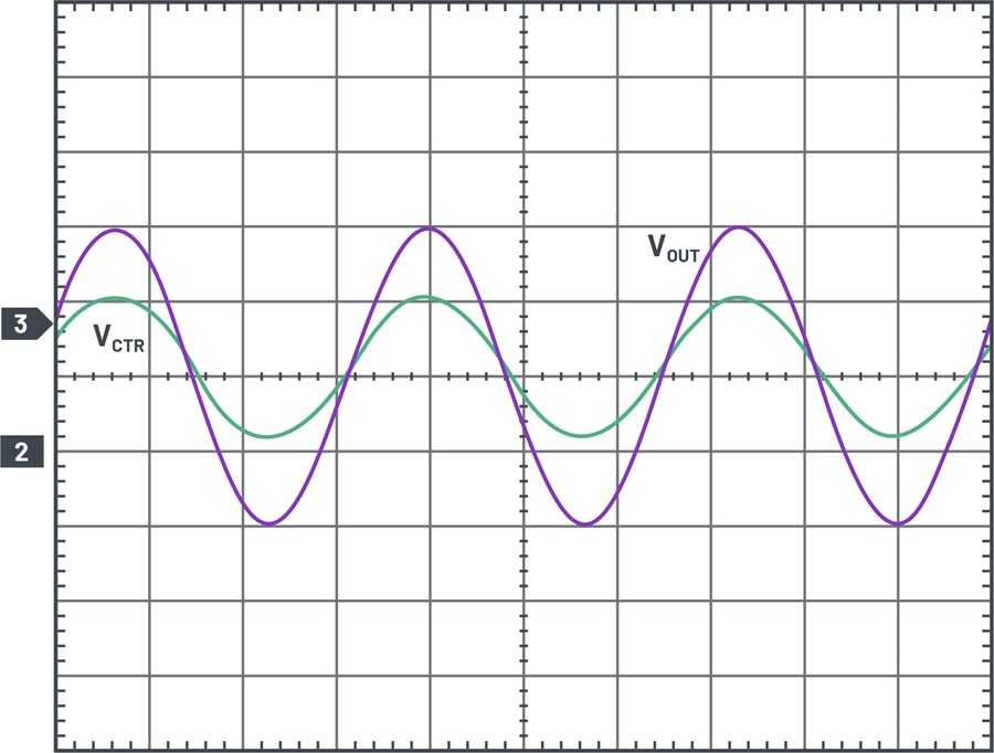 図3 サイン波制御信号とサイン波出力波形の関係。VCTRL= 0.5V/div、VOUT = 5V/div、時間スケールは5ms/div。