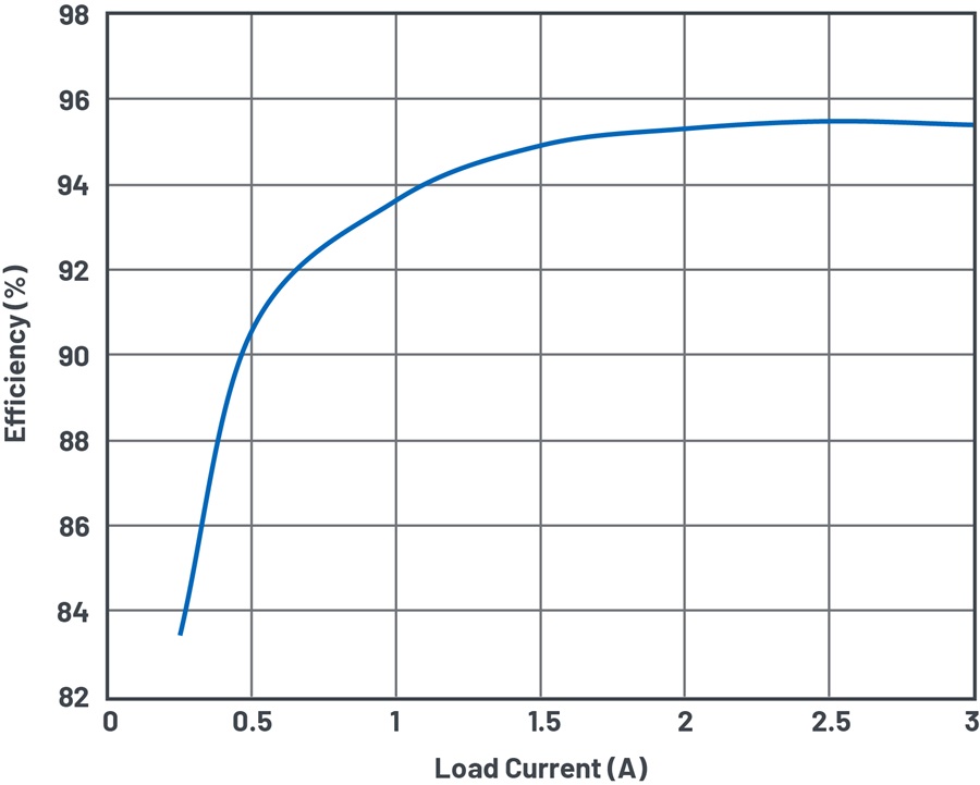 この手法は、標準的な2段構成デバイス(すなわち昇圧コンバータの後段で降圧/反転を行うもの)よりもシステムの効率が著しく向上します。これは、システムがその動作中ほとんどPass-Thruモードの状態にあり、このモードでは効率が100%に近く、電源システムは実質的に1段構成のコンバータと同じになるためです。例えば、コールド・クランキング時に入力電圧が12V未満に低下すると、昇圧コンバータがスイッチングを再開し、VINTERを12Vに維持します。このアプローチでは、入力電圧が急激に低下した場合でも4象限コンバータによって±10Vを供給できます。