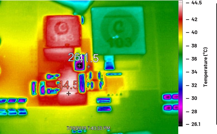 この動作モードは試験台上で検証され、テスト済みですす。これを行うために、図1に示す回路のVOUTを12.5Vに設定された実験室電源に接続し、VINを電子的負荷に接続して、コンバータに流れる電流を4.5Aにセットしました。4象限コンバータの熱画像を図5に示します。