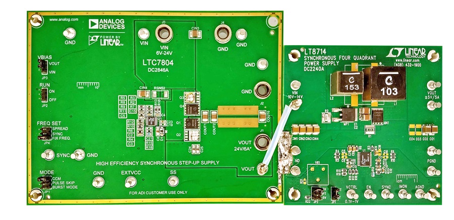 図6 アナログ・デバイセズの2枚の既成デモ・ボードをハンダ付けして作成した試験装置の写真。左側がLTC7804(DC2846A)、右側がLT8714(DC2240A)。