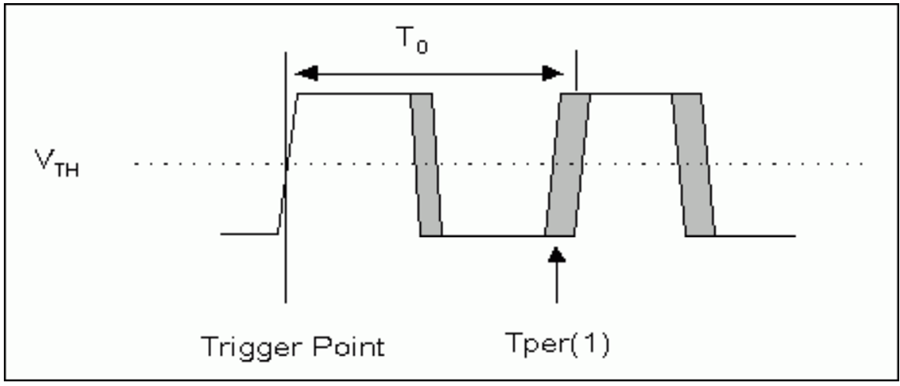 周期ジッタ(JPER)は測定されたサイクル周期と理想的なサイクル周期の間の時間差です。このジッタはランダム性であるため、ピークトゥピークまたは実効値(RMS)で測定することができます。はじめにクロックの立上りエッジがスレッショルドVTHをクロスする点をTPER(n)と定義します。ここで、nは図1に示す時間領域における指標です。数学的にはJPERを次のように表すことができます: