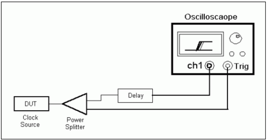 周期ジッタの測定に使用される他の測定器があります。この測定を行うために大抵は高精度のディジタルオシロスコープを使用します。クロックジッタがオシロスコープのトリガージッタよりも5倍を上回る大きさの場合は、クロックの立上りエッジでトリガーして、次の立上りエッジでクロックジッタを測定することで、クロックジッタを獲得することができます。図3は試験対象のクロックからトリガー信号を生成するスプリッタを示します。これはディジタルオシロスコープのクロック源から内部ジッタを除去する方法です。