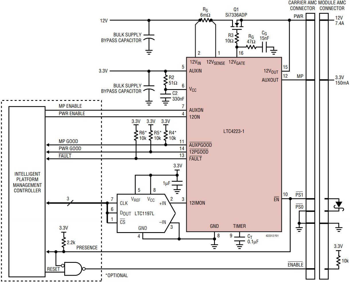 In a typical AdvancedMC application, the LTC4223 resides on the carrier board, delivering 12V and 3.3V auxiliary power to the modules, as shown in Figure 1. It controls the 12V main supply with an external N-channel MOSFET and the 3.3V auxiliary supply with an integrated 0.3Ω switch. The current for the 12V supply is monitored via sense resistor RS. The monitored current is reproduced as a relative voltage signal at the 12IMON pin. This signal can be fed to a control system using an LTC1197L ADC.