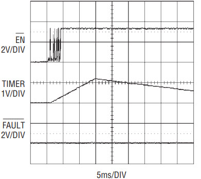 When the connector pin PS1 is engaged low upon card insertion, EN goes low and initiates a start-up debounce cycle if the ON pin is high. Any contact bounces on the EN pin reset the TIMER and restart the ramp up until it reaches 1.235V, at which time the fault latches are cleared. If EN remains low at the end of the debounce cycle, the switches are allowed to turn on. If EN toggles high indicating card removal, all switches are turned off in 20µs, disconnecting the supplies to the modules. Latched faults are not cleared. However, because removing the card could cause the EN pin voltage to bounce, the clearing of latched faults is blanked internally by a TIMER ramp-up time given by CT • 123[ms/µF], as shown in Figure 2.