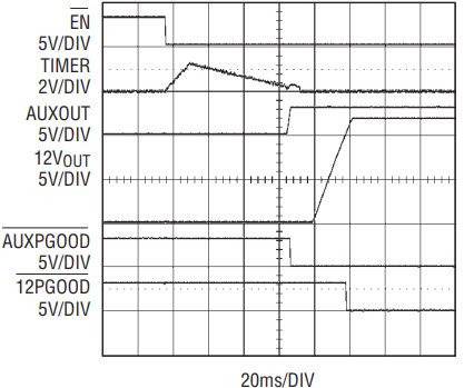 Figure 3 shows the 3.3V auxiliary and 12V supplies powering up in sequence after EN transitions low. The pre-conditions for start-up are: VCC and the input supplies exceed their undervoltage lockout thresholds, TIMER is less than 0.2V and EN is pulling low. If all of these conditions are met, a debounce timing cycle is initiated when the ON pin pulls high. By default, the internal Aux switch turns on first if both ON pins are high at the end of the debounce cycle. This satisfies the requirement to power up the controller first on the AdvancedMC module before turning on the 12V supply.