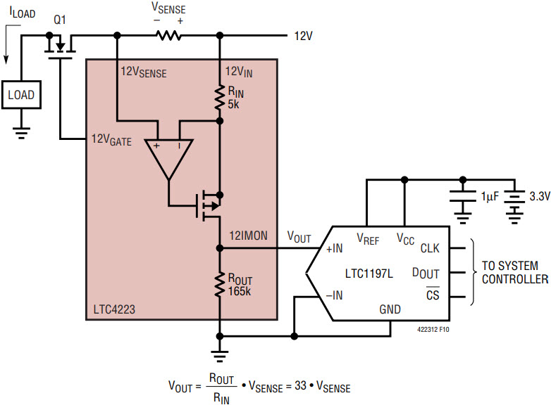 The LTC4223 features a high side current sense amplifier for the 12V supply that translates the sense resistor voltage drop from the positive rail to the negative rail. The voltage at the 12IMON pin is equal to 33 • VSENSE. This can drive the input of an LTC1197L ADC, as shown in Figure 4 for data conversion, and allows the system controller to monitor the power consumed by the AdvancedMC module. Full scale input to the current sense amplifier is 82.5mV corresponding to an output of about 2.7V. If the input exceeds 100mV, the 12IMON output clamps at 3.2V.
