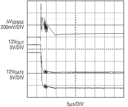 Figure 5. Fast acting current limit isolates severe short-circuit fault on 12V output.