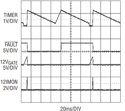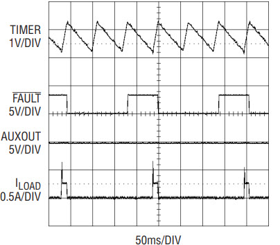 The latched fault is cleared during the start-up cycle and FAULT pulls high. If the output-short persists, the device powers up into an output-short with active current limiting until the TIMER times out and FAULT pulls low again. The device restarts after a cool-off cycle and the process repeats until the output-short is removed. The cool-off cycle time is given by CT • 1358[ms/µF] after a 12V supply fault and CT • 1482 [ms/µF] after an auxiliary supply fault. If the TIMER capacitor CT = 0.1µF, the auto-retry duty cycle is 0.5% for the 12V supply and 6.5% for the 3.3V auxiliary.