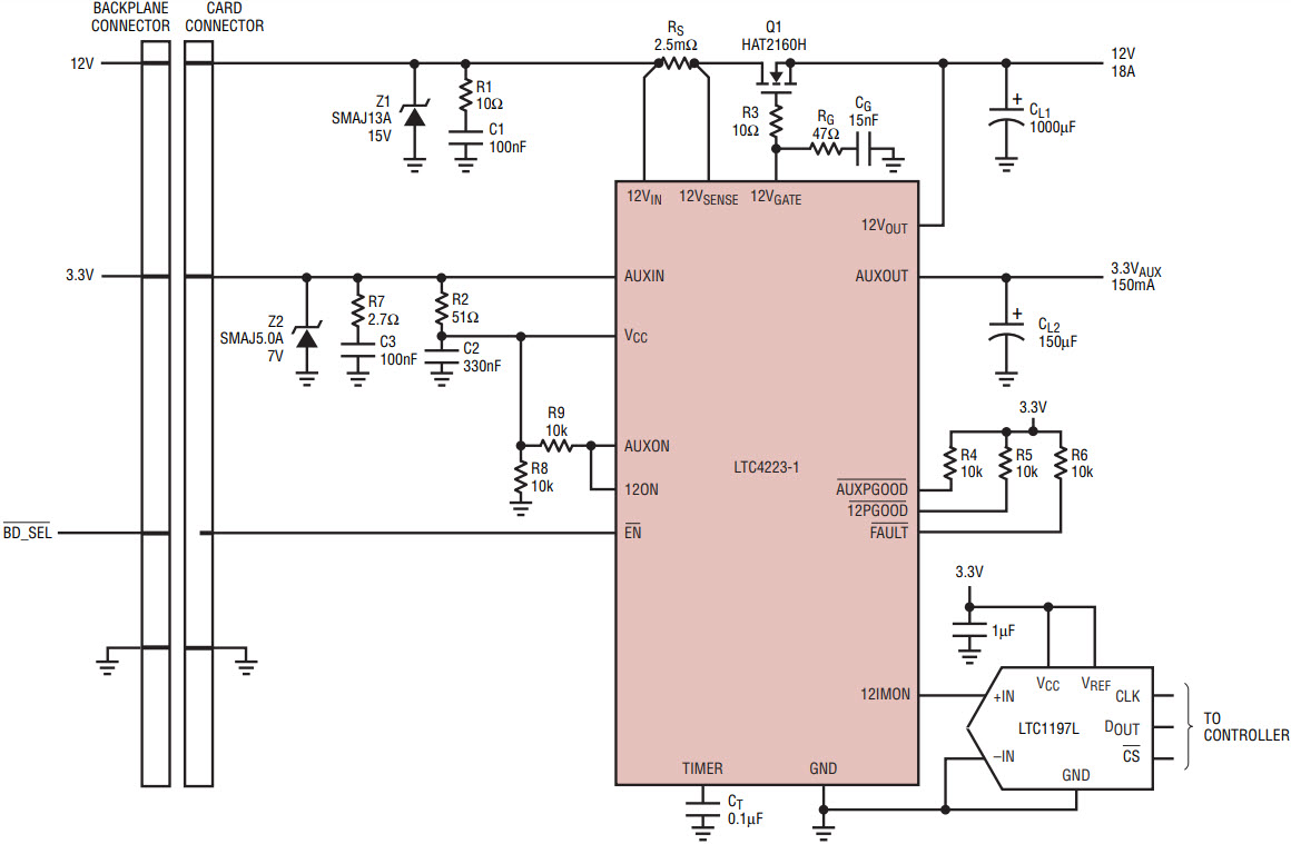 In addition to the AdvancedMC application where the LTC4223 is on the carrier board, it can also reside on the plug-in card side of the connector. Figure 9 shows a typical 12V at 18A application. The 3.3V auxiliary supply may be used to power up on-board logic drawing not more than 150mA. The 12V supply inrush current is limited to 0.7A by RG/CG compensation network when powering up into a large load capacitor of 1000µF. When no bulk capacitor is present on the card supply, transient voltage suppressors (Z1, Z2) are required to clamp supply transients and the snubber (R1/C1, R7/C3) eliminates ringing during an output-short. For the LTC4223 to work with a different load at 12V output, choosing the correct sense resistor and external MOSFET is crucial. This ensures that the circuit breaker threshold is not exceeded under the maximum load condition, and that the power dissipated in the MOSFET is well within its safe operating area (SOA) while in active current limit during an output-short.