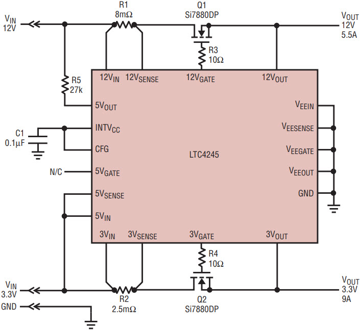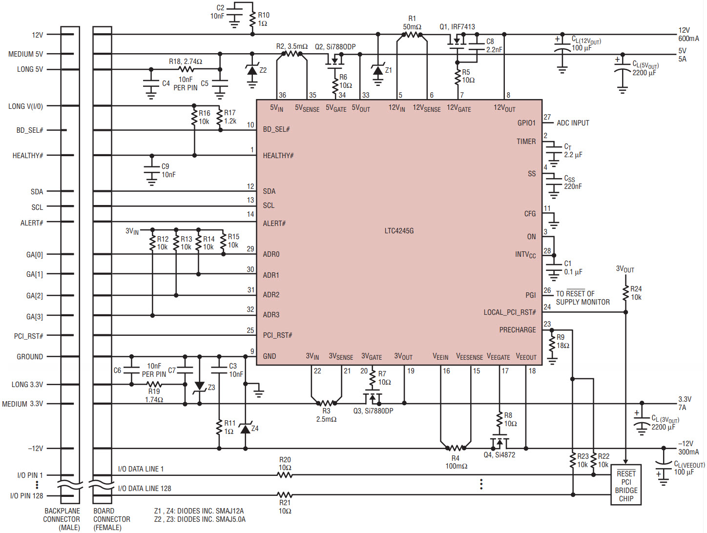 The LTC4245 is designed to be used in a CompactPCI (CPCI) Hot Swap board, where the four supplies are 12V, 5V, 3.3V, with an optional –12V. The LTC4245 can also work with one 12V and two 3.3V supplies as in a PCI Express system. Other features of the device include: