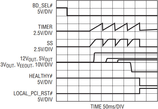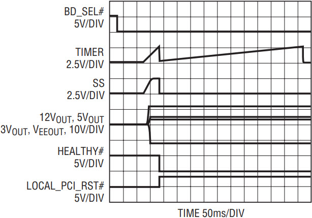 Figure 2 shows the backend supplies powering up after BD_SEL# goes low. Internal current sources charge up the gates to turn on the external switches. The TIMER pin is pulled up to 2.56V with 100µA and is then reset to ground by an internal switch. Current limit faults are ignored until TIMER falls to 0.23V. HEALTHY# pulls low at the end of this start-up timing cycle if all supply outputs are above their power bad thresholds. LOCAL_PCI_RST#, which was low, now follows PCI_RST#. A 10µA current pulls up on TIMER to start the power good input timeout cycle. The PGI pin must remain high at the end of the cycle, or all the switches are turned off.