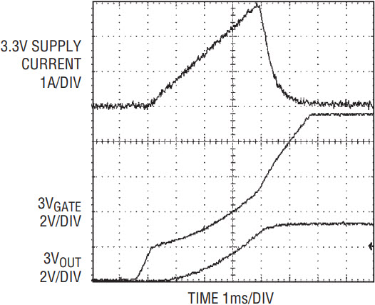 Figure 3. dI/dt controlled soft-start on 3.3V supply during sequenced turn-on. Inrush current rise rate of 750mA/ms is set by the SS pin capacitor.