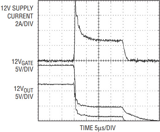 The other job of a Hot Swap controller, apart from controlling inrush current, is to prevent faults on the output from propagating to the input and affecting other boards in the system. The LTC4245 features an electronic circuit breaker with a 20µs filter and a fast current limit at 3× the circuit breaker threshold for each supply. In the event of a short circuit at the output, the fast current limit pulls the gate of the MOSFET to the source in less than 1µs. Figure 4 illustrates this for the 12V supply. This limits the fault current and prevents damage to board traces and connector pins. The 20µs filter prevents temporary load current surges from activating the gate pull-down, eliminating unnecessary board resets.