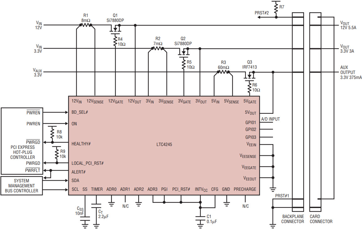 Figure 6 shows the LTC4245 on a PCI Express backplane controlling one 12V and two 3.3V supplies. The VEE pins are all tied to ground. PRST#1 and PRST#2 signals sense when the plug-in card is seated. These signals are used by the PCI Express Hot-Plug Controller to command the LTC4245 to turn the switches on and off. Figures 7 and 8 show the LTC4245 controlling just two supplies, one of them 12V, the other being either 3.3V or 5V.