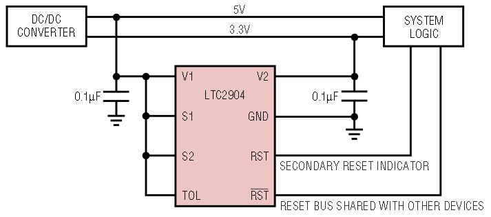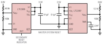 Figure 9 shows an LTC2906 and an LTC2907 cascaded together to monitor four voltages. In this particular application, the two supervisors are configured to monitor 3.3V, 2.5V, 0.8V and 0.6V, each with 5% tolerance. The RST outputs of the two supervisors are wired-OR together to form a master system reset. Because of the open-drain configuration on the RST pin, the master system reset is low once any of the four voltages goes below their respective thresholds. The additional RST pin on the LTC2906 can be used as a secondary reset indicator, indicating which of the two supervisors issues the reset in a particular reset condition.