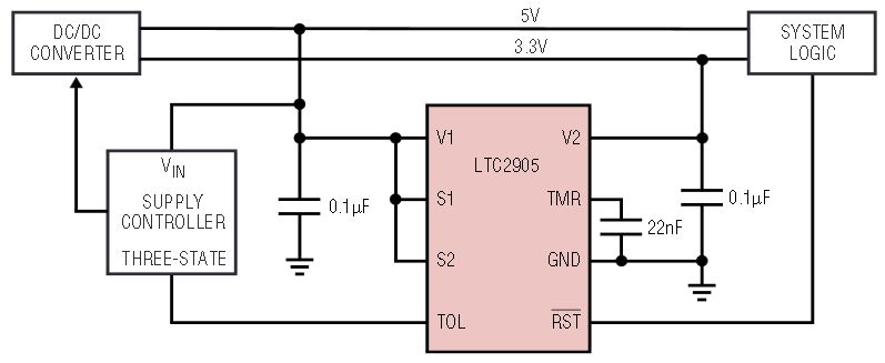 Second, the S1 and S2 pins can be driven by 3-state outputs for a more aggressive lowering of the trip threshold. For example, in Figure 10 the S1 and S2 pins are tied to V1 to configure the part to monitor 5V and 3.3V. If TRI-STATE buffers are added to drive the S1 and S2 pins, these pins can be set to GND during testing. Connecting S1 and S2 to GND configures the LTC2905 to monitor 2.5V and 1.8V, a significant change in trip threshold from the 5V and 3.3V thresholds respectively. During normal operation, the TRI-STATE buffers can set S1 and S2 back to V1 (High) so that the part is again configured to monitor 5V and 3.3V.