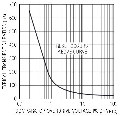 The four new supervisors discussed here take a different approach to solve this problem. The first line of defense against this spurious reset for these supervisors is a first order low pass filter at the output of each of the comparators. Thus, the comparator output is integrated over time before triggering the output logic. Any transient at the input of the comparator must be of sufficient magnitude and duration before it triggers a change in the output logic. Figure 3 shows the typical transient duration versus comparator overdrive required to trip the comparators (overdrive shown as a percentage of the trip threshold VRTX).