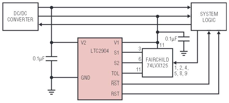 Therefore, the LTC2904, LTC2905, LTC2906 and LTC2907 supervisors offer micropower operation, small size and high accuracy. The highly integrated functionality makes these devices easy to design into systems requiring two or more supervisory applications. Table 1 shows a feature summary of these four devices and Figure 1 shows a typical dual supply monitor application using the LTC2904.