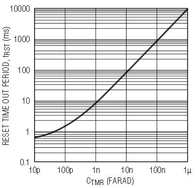 Figure 6 shows the desired delay time as a function of the value of the timer capacitor that should be used. Leaving the TMR pin open sets the reset time-out to approximately 200μs. The only limitation to the length of the period is the value of the capacitor and its leakage. The TMR capacitor does not charge if the leakage current exceeds the TMR charging current of 2μA (typical).
