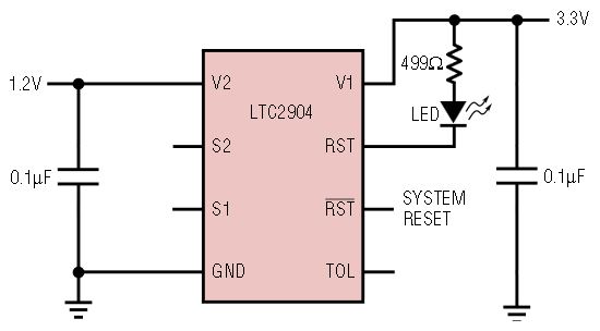 Figure 8 shows the LTC2904 configured as a dual monitor in an application for a system using a 3.3V and 1.2V supply. In this particular application the monitor is configured to have 7.5% tolerance. With a guaranteed 2.5mA pull-down current at the RST pin, an LED can be used in series with a 499Ω pull-up resistor as a power good indicator.