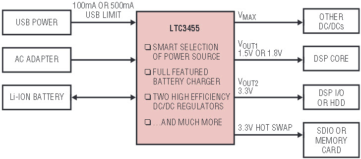 The LTC3455 simplifies the design of portable applications. It is a complete power management solution, incorporating two step-down DC/DC converters, a USB power controller, a full-featured Li-Ion battery charger, a Hot Swap output, and a low-battery indicator—all squeezed into a tiny 4mm × 4mm QFN.