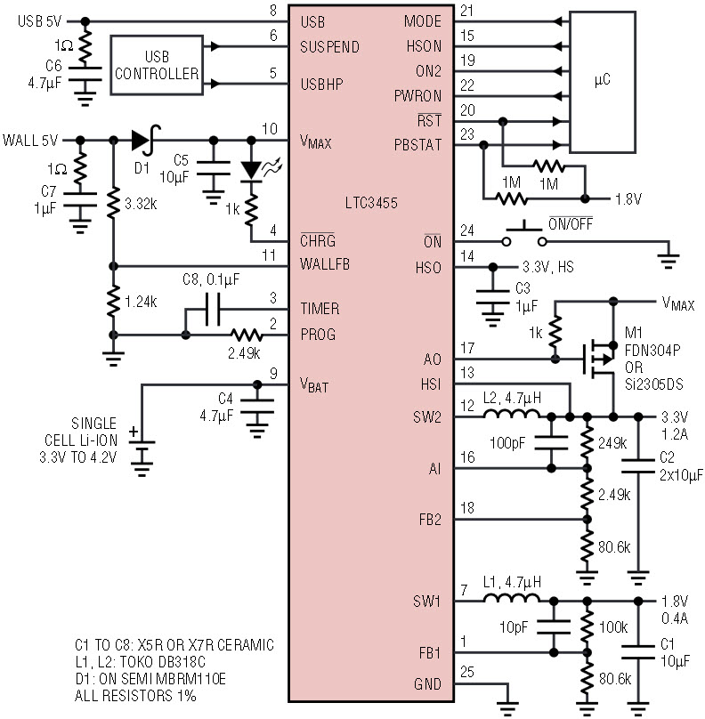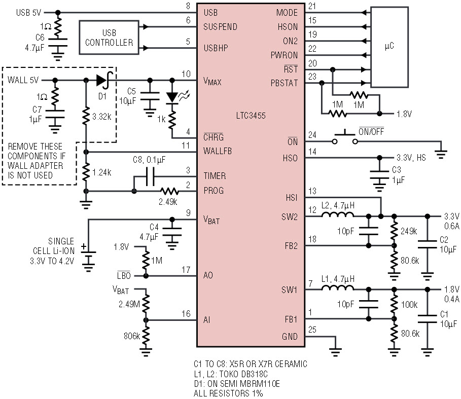 The simplicity of a typical LTC3455 application is shown in Figure 2. Efficiencies for the DC/DC converters in this application are shown in Figure 3. The device handles important system startup and protection issues internally (soft-start, supply sequencing, charger thermal limiting, current limiting for all outputs, etc.) which helps minimize the number of external components. The circuit is even simpler for applications that require only a battery and USB power, without the 5V wall adapter (see note in Figure 2).