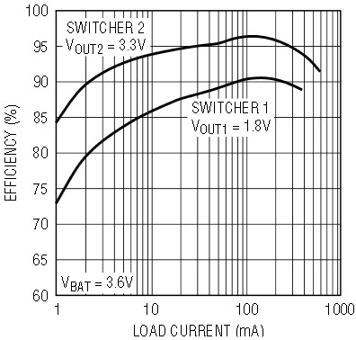 The LTC3455 contains two 1.5MHz constant-frequency current-mode switching regulators that operate with efficiencies up to 96%. Switcher 1 provides up to 400mA at 1.5V/1.8V (to power a microcontroller core), and Switcher 2 provides up to 600mA at 3.3V (to power microcontroller I/O, memory and other logic circuitry). Both converters support 100% duty cycle operation (low dropout mode) when the input voltage drops very close to the output voltage, and both are capable of Burst Mode® operation for highest efficiencies at light loads (Burst Mode is pin selectable). Switcher 2 has independent ON/OFF control, but operates only when Switcher 1 is also enabled and in regulation. If both are enabled at initial power-up, Switcher 2 turns on only after Switcher 1 has reached 90% of its programmed value. This power-up delay ensures proper supply sequencing and reduces the peak battery current at startup.