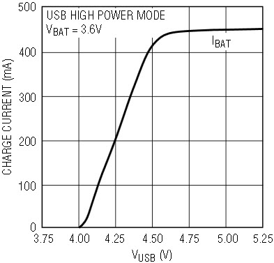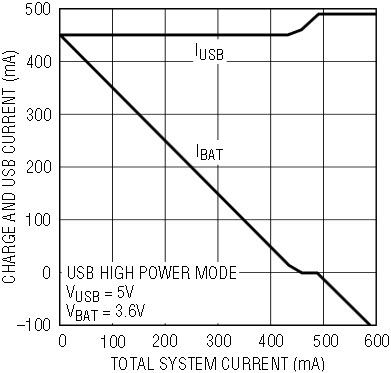 The internal USB power controller also automatically throttles back the battery charge current to help keep the total system current under the strict 500mA or 100mA USB limit. The rest of the system draws whatever current it needs, but the battery charge current is reduced to try and keep the total system current below the strict USB 500mA/100mA limit. The graph in Figure 5 shows how charge current, IBAT, decreases as the current needed for the rest of the system increases (both switchers and all other external devices pull current from the VMAX pin). The total USB current, IUSB, always stays below 500mA.