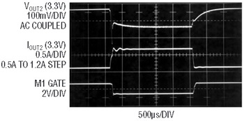 When the load current exceeds what Switcher 2 can provide, the 3.3V output droops slightly and the LDO provides the additional current needed. Figure 7 shows the transient response when the 3.3V output current is stepped from 0.5A to 1.2A. More output capacitance can be added to improve the 3.3V transient response during these high current load steps.