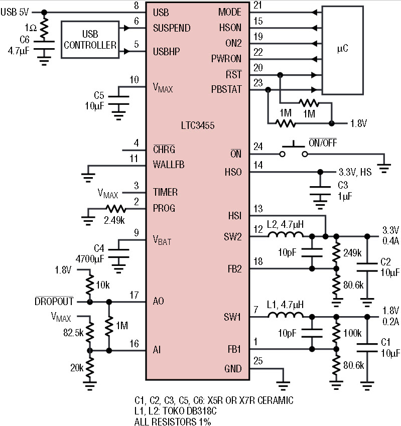 Although designed primarily for Li-Ion powered portable applications, the LTC3455 is also a good choice for systems that are always powered by a USB supply or wall adapter. The battery charger can then be used to charge up a large capacitor or backup battery, which briefly provides power to the system after the external power has been removed. This gives the microcontroller enough time to follow proper shutdown procedures when the main power source is abruptly removed.