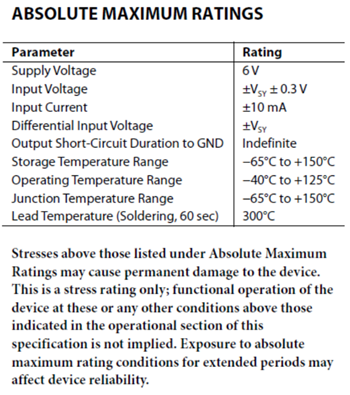 絶対にいけません! デバイスに恒久的な損傷を与えないようにするためには、データシートに記載されている絶対最大定格を超えないようにすることが不可欠です。絶対最大定格はデバイスが耐えられる限界値を示しており、この値で動作できるという意味ではありません。たとえば、絶対最大定格より高い入力電圧を使用すると、オペアンプの両入力にブレークダウンが発生し、過剰な電流が流れます。この結果、性能が劣化するだけでなく、金属マイグレーションが発生することにより、時間を経るとデバイスが恒久的に破壊されます。つまり、絶対最大定格の値に近づけないようにすることです。そうしなければ、デバイスが破壊される可能性が非常に高くなります。