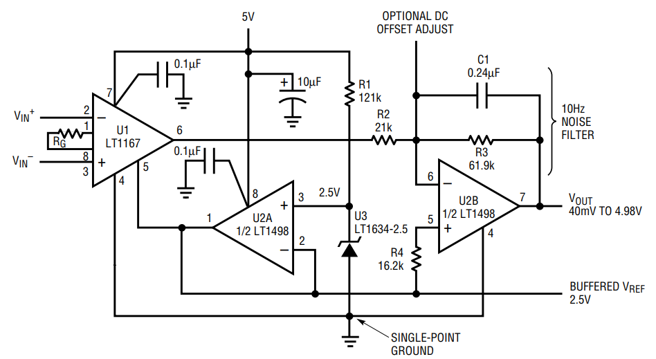 Designing the LT1167 Instrumentation Amplifier into a Single 5V Supply Application