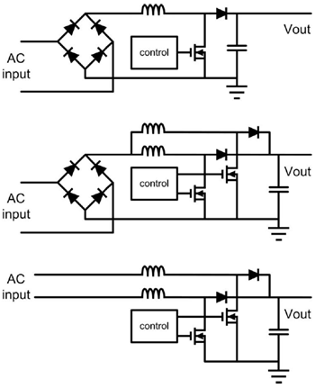 For very high power efficiency one can also go bridgeless. In this case, the diode bridge rectifier can be omitted. In the interleaved operation with a diode bridge rectifier, the two channels are alternating after each switching period. In the bridgeless topology however, one channel switches during the positive half wave of the ac input voltage and the second channel switches during the negative half wave. Figure 1 shows a principle circuit diagram of these three basic circuits. The top shows the easiest implementation, the middle the interleaved concept, and the bottom the bridgeless configuration. Of course, many more circuit implementations are possible. For high power and very efficient operation, one can combine interleaved operation with a bridgeless setup, for example. Obviously such designs require many components and can become quite complex. The ADP1047 is intended for single-channel PFC, while the ADP1048 offers the capability for interleaved and bridgeless operation. For this purpose it offers a current sharing function as well as two different PWM output signals.
