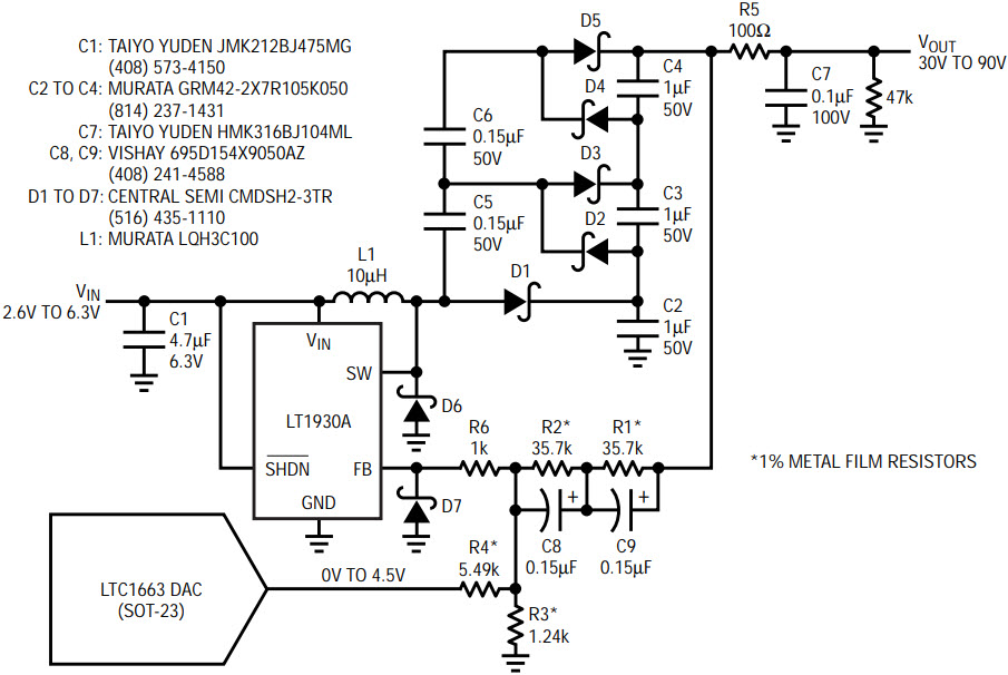 Figure 1 shows a high voltage, low noise APD bias supply that works from an input range of 2.6V to 6.3V. The DAC, driven from a processor, adjusts the output from 30V to 90V to compensate for temperature dependent APD gain fluctuations. The LT1930A includes a 35V switch making it capable of producing 105V output through a capacitor-diode tripler.