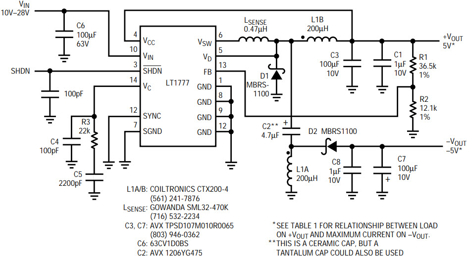 The circuit in Figure 1 shows three inductors: L1A, L1B and LSENSE. L1A and L1B are two windings on a single core to generate ±5V. C2 has been added to minimize coupling mismatches between the two windings (L1A and L1B); this forces the winding potentials to be equal and improves cross-regulation. This creates the dual SEPIC (single-ended primary inductance converter) topology. LSENSE is a user-selectable sense inductor to program the dI/dt ramp rate (see the LT1777 Data Sheet for more information). Table 1 summarizes the allowable load current on the –5V supply as a function of input supply voltage and the load current on the 5V supply. Note that 5V and –5V supplies are allowed to droop by 0.25V, which corresponds to 5% load regulation.