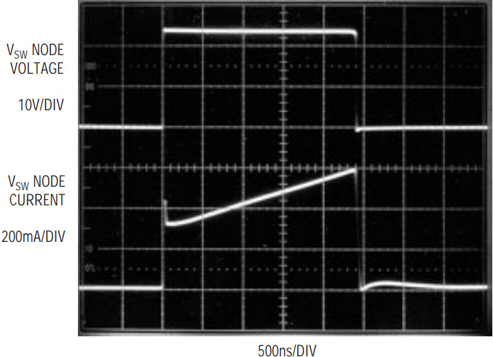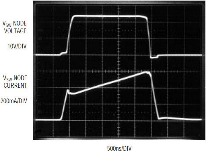 The LT1777 is a step-down regulator specially designed for low noise applications. In order to achieve low noise, the LT1777 is equipped with dI/dt limiting circuitry, which is programmed via a small external inductor in the power path. It also contains internal circuitry to limit the dV/dt turn-on and turn-off ramp rates. Figure 2 shows the VSW node voltage and the VSW node current for the low noise LT1777. Figure 3 shows the VSW node voltage and VSW node current for the high voltage LT1676 buck regulator under the same test conditions. It can be seen from Figures 2 and 3 that the switch node voltage and current waveforms for the LT1777 are more controlled and rise and fall more slowly than those of the LT1676 regulator. By slowing down the sharp edges during turn-on and turn-off for the power switch, conducted and radiated EMI are reduced.