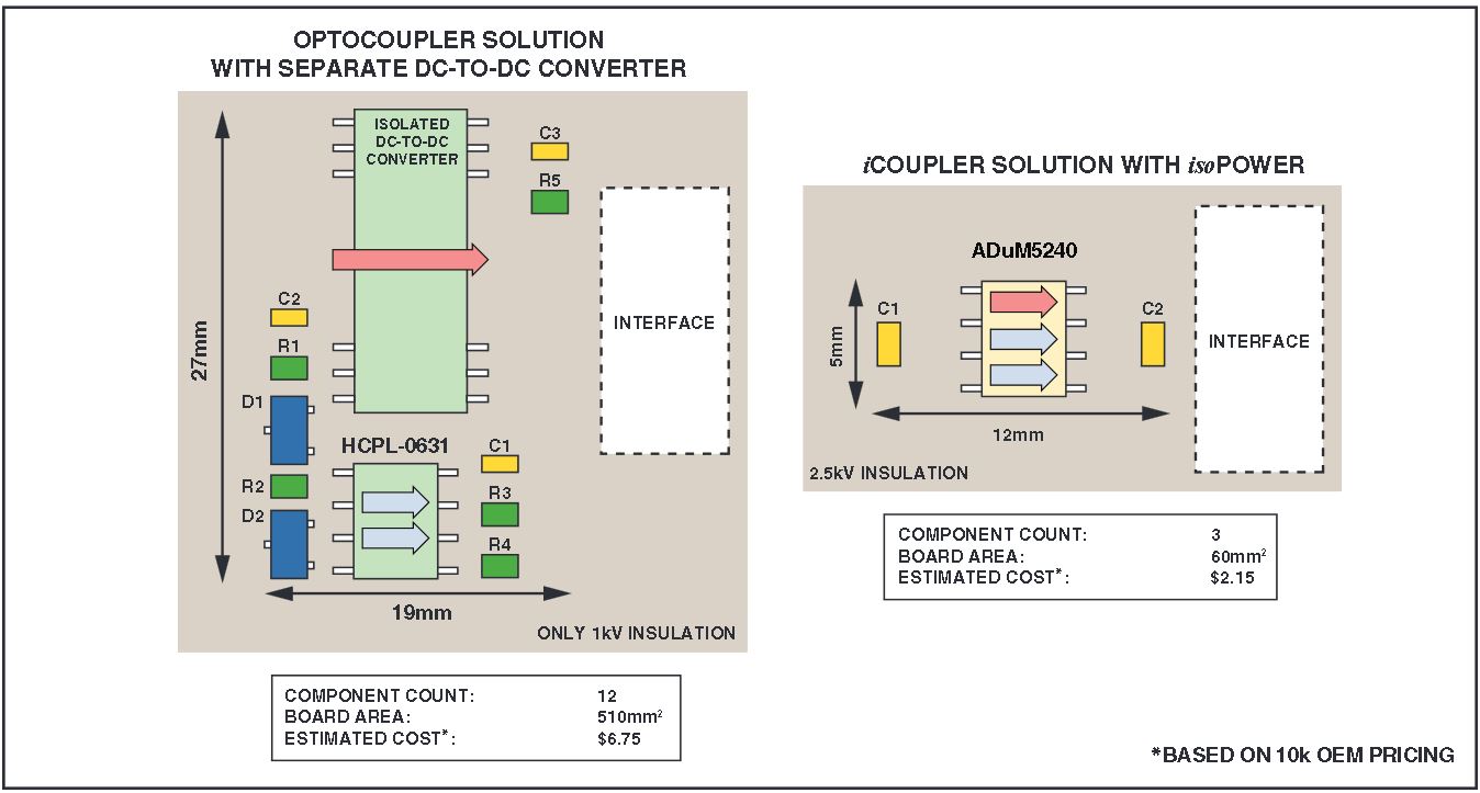 iCoupler technology with isoPower provides a complete isolation solution within a single package. Not only does it offer state-of-the-art digital signal isolation having substantial advantages over optocouplers in terms of power, size, and performance, but it also eliminates the need for a separate, isolated power supply. The iCoupler technology provides unprecedented possibilities for functional integration that can dramatically reduce the complexity, size, and total cost of the isolated systems.