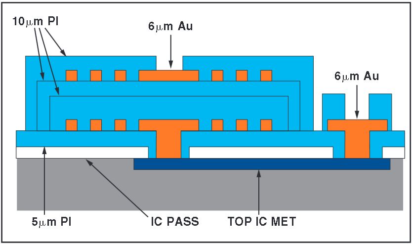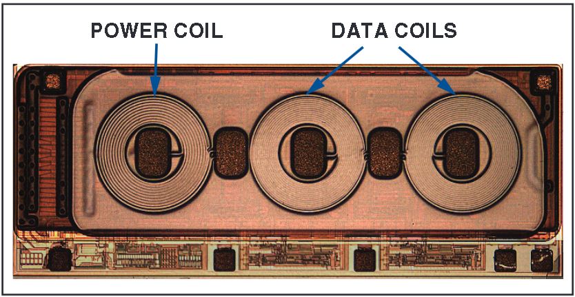 The microtransformers used in iCoupler devices are built on top of a CMOS substrate. Figure 2 shows a cross section of the isolated transformer structure, and Figure 3 is a die photo with both power and signal transformers. The transformer series resistance is minimized through the use of 6 μm thick plated Au for both the primary and the secondary spirals. The 20 μm thick polyimide in between the primary and the secondary provides HV isolation up to 5 kV. The additional 5 μm thick polyimide under the bottom spiral helps to reduce substrate capacitance and substrate loss. The substrate loss is further reduced through a carefully designed patterned ground shield using available underlying IC metal. The proximity effect and eddy current loss is less of a concern for the stacked transformers with large magnetic coupling coefficient. The design of the coils can be done through the optimization of coil parameters, such as the number of turns, trace width, and trace pitch. The quality factor (Q) at 300 MHz can be as high as 20 for the top coil and 15 for the bottom coil. The high Q for the microtransformer structure makes an efficient power transfer possible.