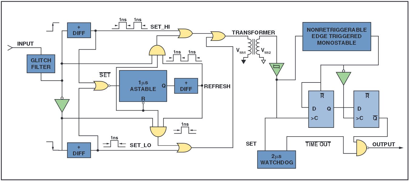 The transfer of the digital signal is realized through transmitting short pulses approximately 1 ns wide across the transformers with two consecutive short pulses to indicate a leading edge and a single short pulse as a falling edge. Figure 4 shows the signal transfer block diagram. A nonretriggerable monostable at the secondary generates detection pulses. If two pulses are detected, the output is set to high. On the other hand, if a single pulse is detected, the output is set to low. An input filter helps to increase noise immunity. The dc correctness is guaranteed by refresh signals sent into the transformers when no signal edges are detected for about 1 μs. If the input is high, two consecutive short pulses are generated as refresh pulses, and if the input is low, refresh of a single short pulse is generated. To complement the refresh circuit on the driver side, a watchdog is implemented in the receiver to make sure the output is at a fail-safe state when no refresh pulses are detected.