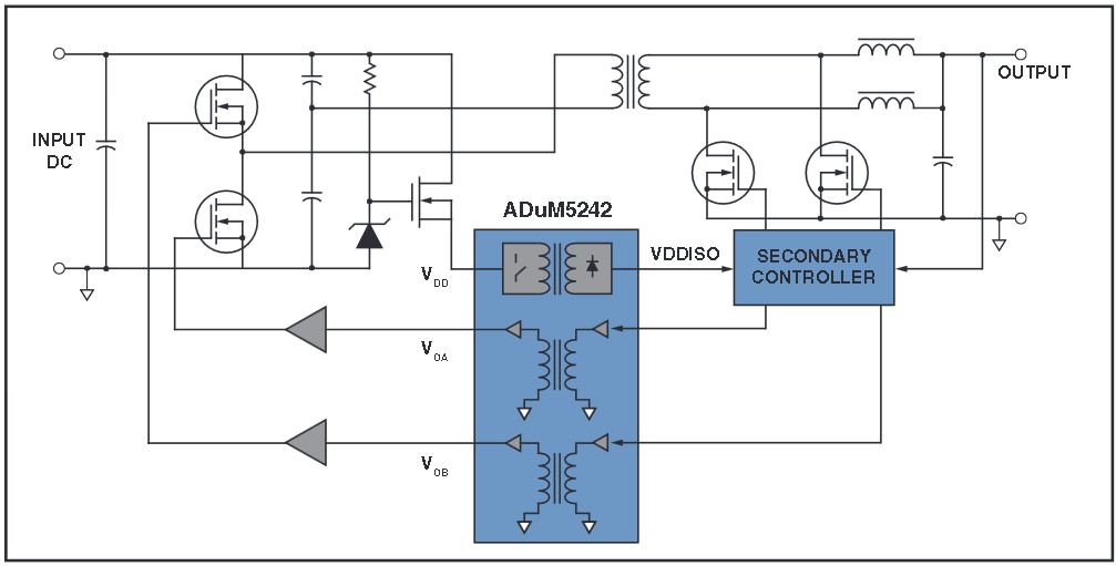 Analog Devices’ ADuM5242, a dual-channel digital isolator with a 50 mW isolated output, is an ideal solution to the start-up problem. This 8-lead SOIC component provides two isolation channels that support PWM signals up to 10 Mbps and 10 mA of 5 V isolated power for the start up of the secondary controller. The user has the further option of disabling the power once the system is started up. The disable is achieved through monitoring the input supply voltage. When the input supply drops below 4 V, the feedback control switch shown in Figure 5 is turned off. Figure 6 is an example application block diagram showing the ADuM5242 in a secondary control system. The two digital signal channels provide the feedback signals from the secondary controller with synchronous rectification to drive the half-bridge drivers at the primary.