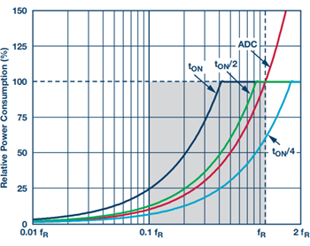 Figure 2 shows theoretical efficiency improvements of the ADC driver amplifier when it is constantly enabled. The vertical reference line at fR represents the sampling frequency at which the power consumption of the ADC equals that of the constantly enabled driver amplifier. At lower sample rates, the amplifier dominates the power consumption and at higher sample rates the ADC dominates. The reference frequency (fR) will vary depending on the power consumption of the amplifier and the chosen ADC, but the basic concepts remain the same. The relative efficiency improvements for the same amplifier being power scaled are shown for three different values of tON. As expected, a shorter tON results in greater efficiency at a given sample rate and enables the use of DPS at higher sample rates. The shaded region shows that the area of greatest improvement for incremental shortening of tON generally extends down to about one decade below fR. As the sample rate continues to decrease below that point, the greatest overall power savings is realized, but the added benefit of further shortening tON is negligible as the power consumption asymptotically approaches that of the power down or disabled state.